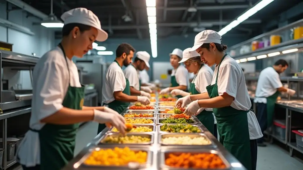 Special cooking machines can help make lots of meals at once, saving time and money on workers. These machines also make sure each meal has the right amount of food, which cuts down on waste and helps create balanced meals.